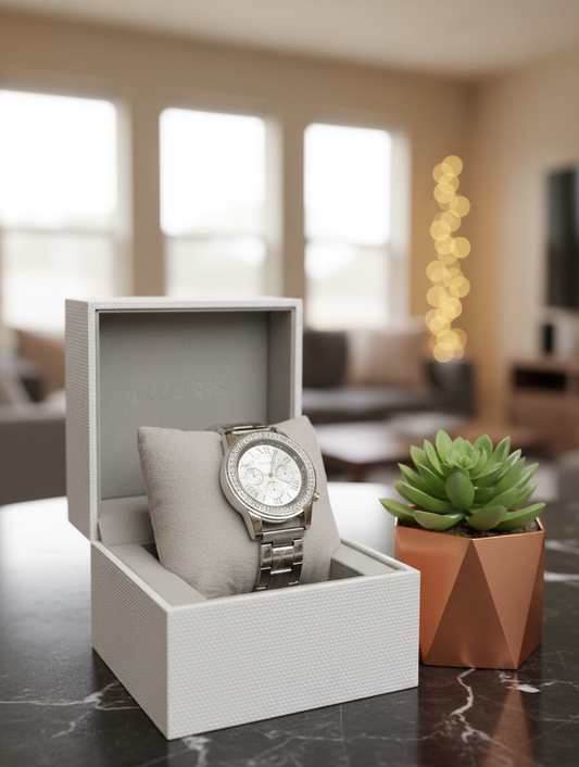 Elegant Silver-Tone Crystal Bezel Watch for Women | White Patterned Dial Link Bracelet